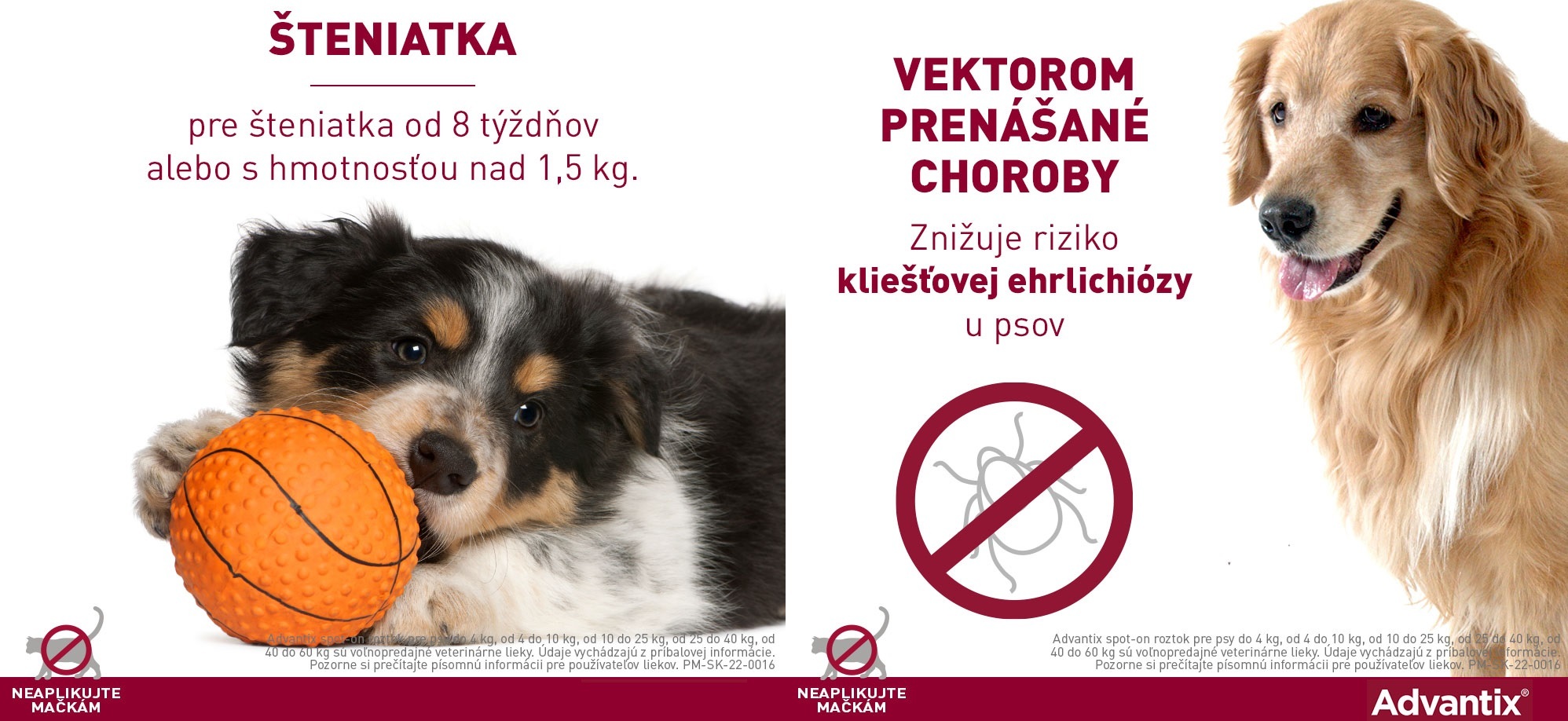 Voľnopredajný veterinárny liek, údaje vychádzajú z SPC. Na vonkajšie použitie. Pozorne si prečítajte poučenie o správnom používaní každého lieku obsiahnuté v písomnej informácii pre používateľov liekov. O účinkoch každého lieku sa bližšie poraďte s lekárom alebo lekárnikom. Advantix znižuje riziko prenosu CVBD - borelióza, rikettsióza, ehrlichióza, leischmanióza alebo dirofilarióza, môže sa použiť ako súčasť liečby alergickej dermatitídy vyvolanej blchami (FAD). Účinná látka: Imidaclopridum, Permethrinum