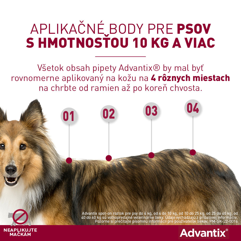 - Na stojaceho psa rovnomerne aplikujte celý obsah Advantix pipety na štyri miesta na chrbte od ramien až po koreň chvosta.