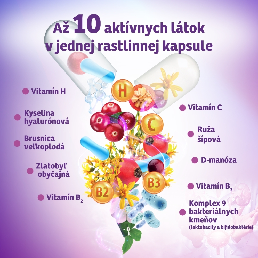 Zloženie: Obsah zložiek v 1 kapsule (0,841 g): extrakt z plodov kľukvy/brusnice veľkoplodej [(Vaccinium macrocarpon), štandardizovaný na 36 % proantokyanidínov (PAC) 126 mg] 350 mg, extrakt z vňate zlatobyle obyčajnej [(Solidago virgaurea), štandardizovaný na 5 % flavonoidov, maltodextrín] 100 mg, D-manóza 100 mg, vitamín C (kyselina L-askorbová) 40 mg (50 % *RVH), extrakt z plodov ruže šípovej (Rosa canina) 30 mg, zmes tyndalizovaných bakteriálnych kultúr [Lactobacillus acidophilus, Lactobacillus rhamnosus, Lactobacillus casei, Lactobacillus plantarum, Lactobacillus reuteri, Bifidobacterium lactis, Bifidobacterium bifidum, Bifidobacterium breve, Streptococcus thermophilus, frukto-oligosacharidy (FOS)] 30 mg (3x109 CFU), protihrudkujúca látka (oxid kremičitý), vitamín B3 – niacín (nikotinamid) 16 mg (100 % *RVH), kyselina hyalurónová (95%) 10 mg, protihrudkujúca látka (stearan horečnatý), vitamín B2 (riboflavín) 1,4 mg (100 % *RVH), biotín (vitamín H, D-biotín, maltodextrín) 50 µg (100 % *RVH). Kapsula je zložená z hydroxypropylmetylcelulózy. *RVH – referenčná výživová hodnota.