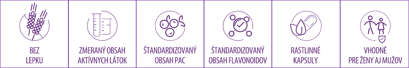 Extrakt z plodov brusnice veľkoplodej (Vaccinium macrocarpon) s garantovaným množstvom bio-aktívnych látok - proantokyanidínov (PAC) - štandardizovaný extrakt na 36 % proantokyanidínov (PAC) = v dennej dávke až 378 mg PAC a až 1 050 mg brusnicového extraktu. Brusnice sú známe tým, že obsahujú veľké množstvo aktívnych látok, ako sú napr. vitamíny a minerály, organické kyseliny, flavonoidy, karotenoidy, triesloviny a ďalšie. Spomedzi nich sa vynímajú práve proantokyanidíny (PAC), ktoré sa považujú za jednu z najaktívnejších látok prítomných v brusniciach.