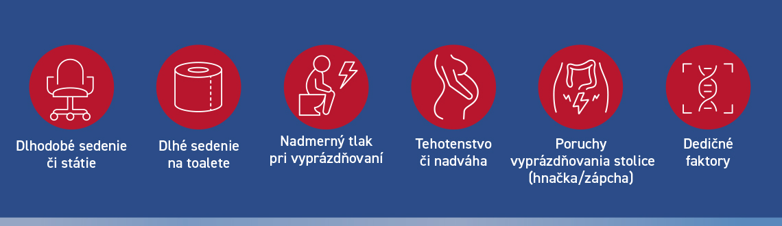 K vzniku hemoroidálneho ochorenia môžu prispieť aj faktory, ako sú dlhodobé sedenie či státie, dlhé sedenie na toalete, nadmerný tlak pri vyprázdňovaní, tehotenstvo, nadváha, poruchy vyprázdňovania stolice (hnačka alebo zápcha), dedičné faktory.