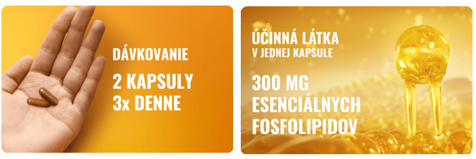 Odporúčané dávkovanie: 2 kapsuly (spolu 600 mg esenciálnych fosfolipidov) 3x denne