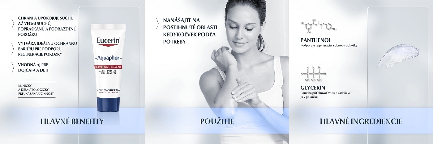 Masť bez obsahu vody Eucerin Aquaphor pomáha obnovovať, chrániť a upokojovať suchú až veľmi suchú, popraskanú a podráždenú pokožku. Vytvára ideálnu ochrannú bariéru podporujúcu regeneráciu pokožky.