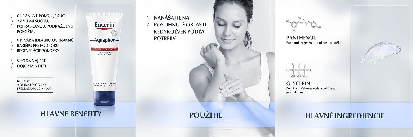 Eucerin Aquaphor Regeneračná masť poskytuje suchej až veľmi suchej, popraskanej a podráždenej pokožke potrebnú SOS starostlivosť. Táto masť bez obsahu vody vytvára na jej povrchu jemnú, polopriedušnú ochrannú bariéru, ktorá podporuje prirodzený transfer vodnej pary a kyslíka dovnútra a von z pokožky, a tak umožňuje pokožke dýchať a posilňuje jej prirodzenú ochrannú bariéru. Pokožka je zregenerovaná, ochránená a obnovená.