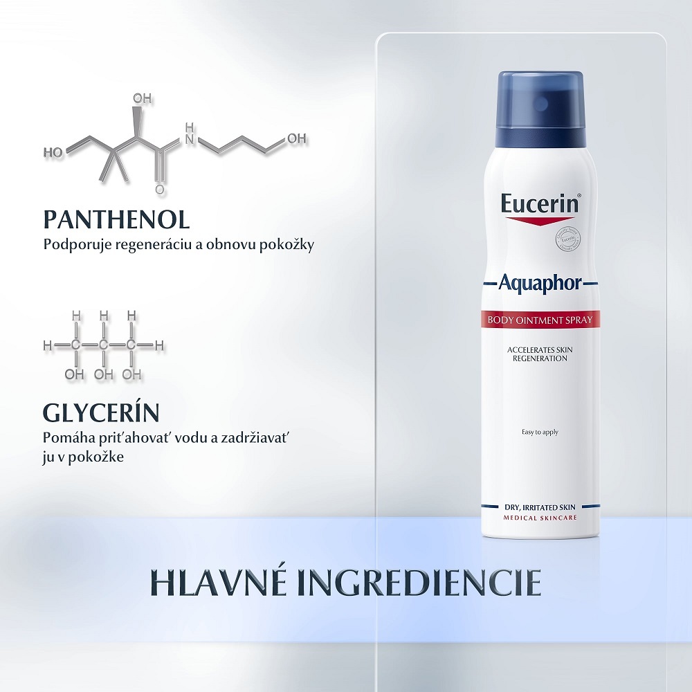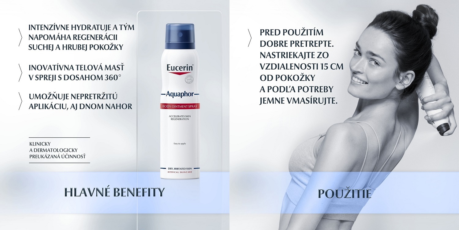 Pri narušení bariérovej ochrannej funkcie našej pokožky sa táto stáva citlivejšou na vonkajšie vplyvy a následne potrebuje obnovu. Nato je vhodným riešením jedine tradičná masť - jej nanášanie je však časovo i prakticky náročnejšie. Eucerin pre to vyvinul Telovú masť v spreji, ktorej aplikácia na pokožku celého tela je neporovnateľne jednoduchšia a rovnomernejšia. Masť neobsahuje vodu a klinické testy preukázali, že obnovuje suchú, podráždenú pokožku - vytvára ideálnu ochrannú bariéru pre regeneráciu pokožky a okamžitý chladivý pocit úľavy.