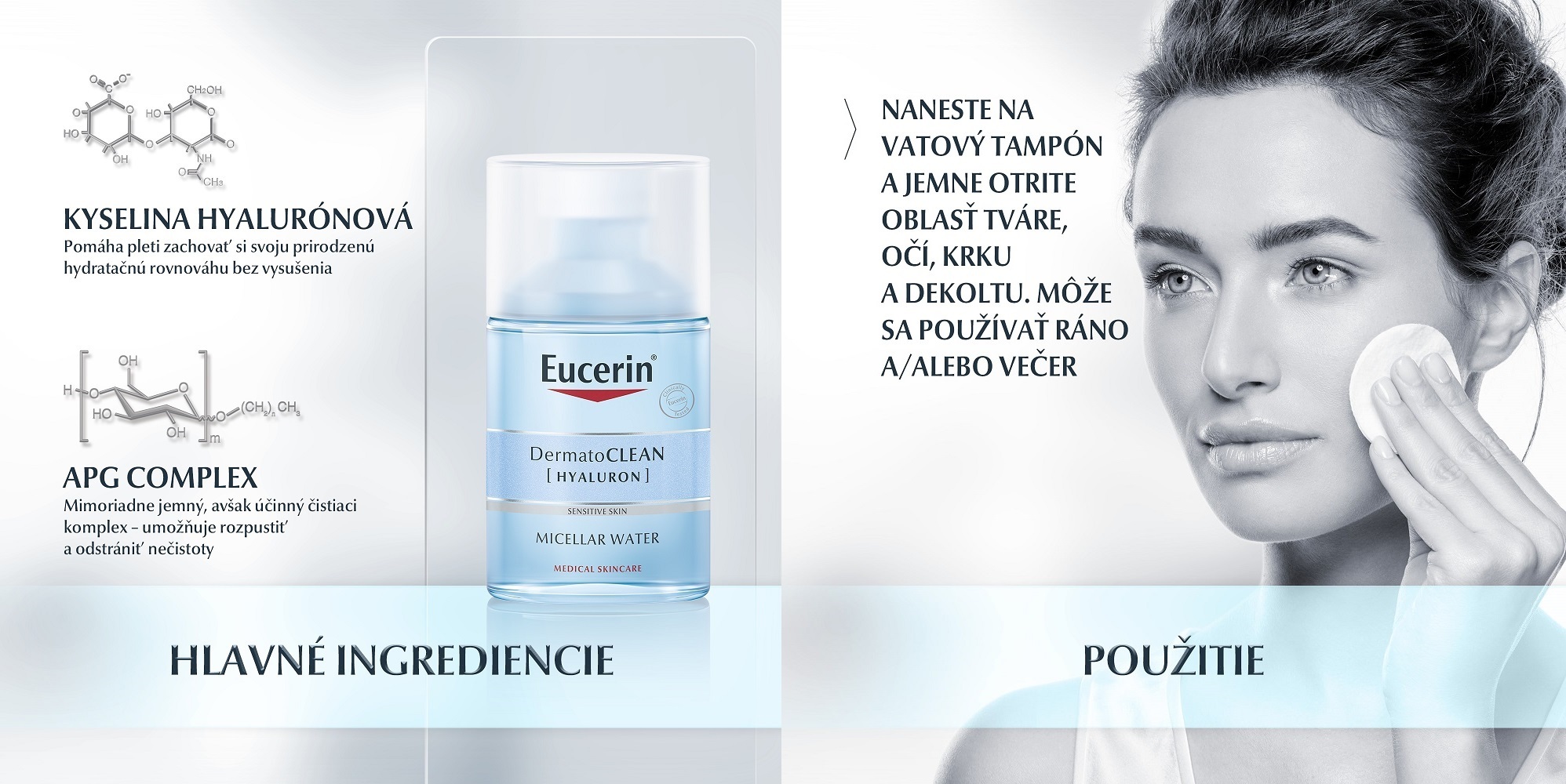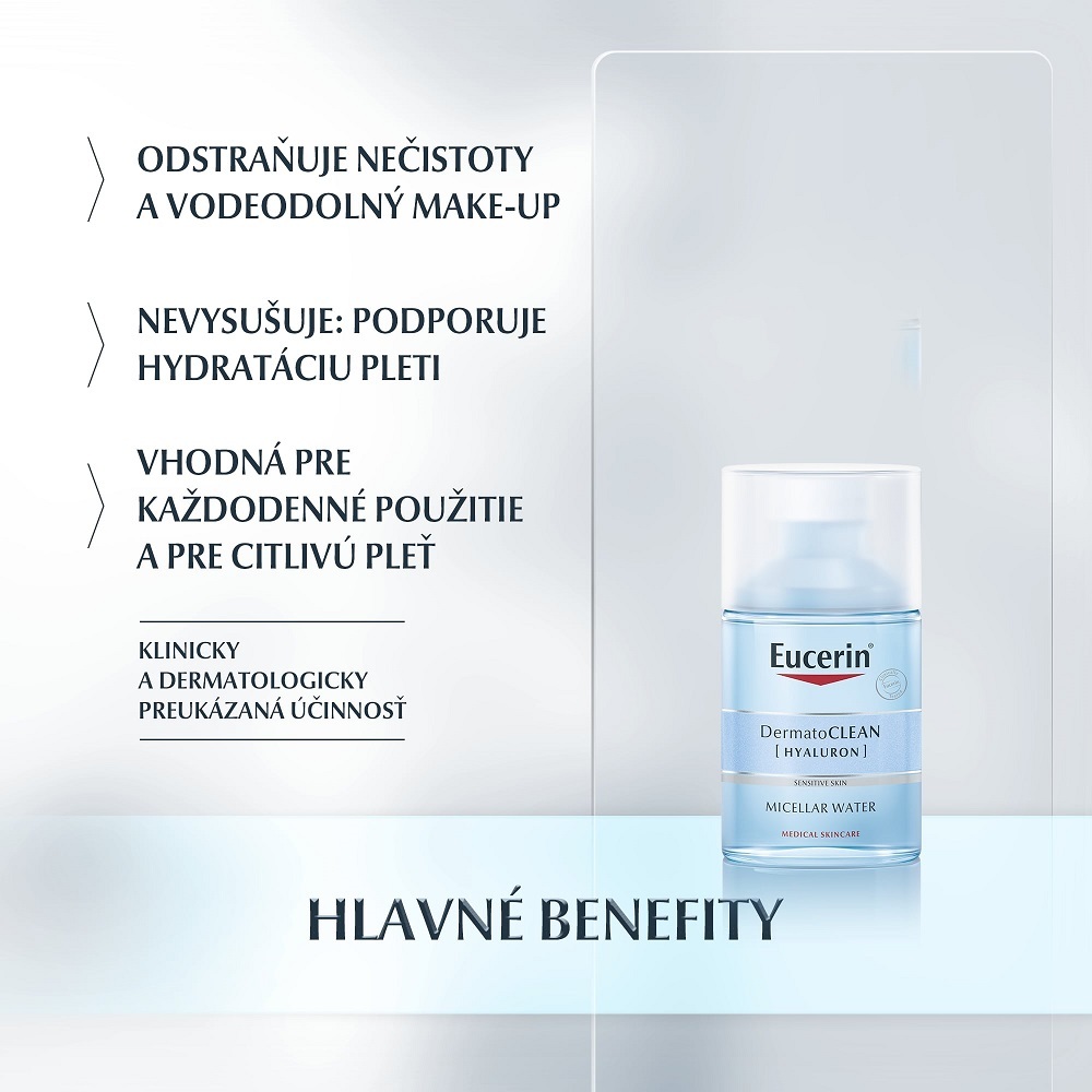 Eucerin DermatoCLEAN Hyaluron micelárna voda 3v1 je jemný, ale pritom účinný micelárny výrobok, ktorý z pleti odstraňuje nečistoty a vodoodolný make-up. Je obohatená o hydratačné zložky, ktoré pleť čistia bez toho, aby ju vysušovali. Vhodná na každodenné použitie aj na citlivú pleť.