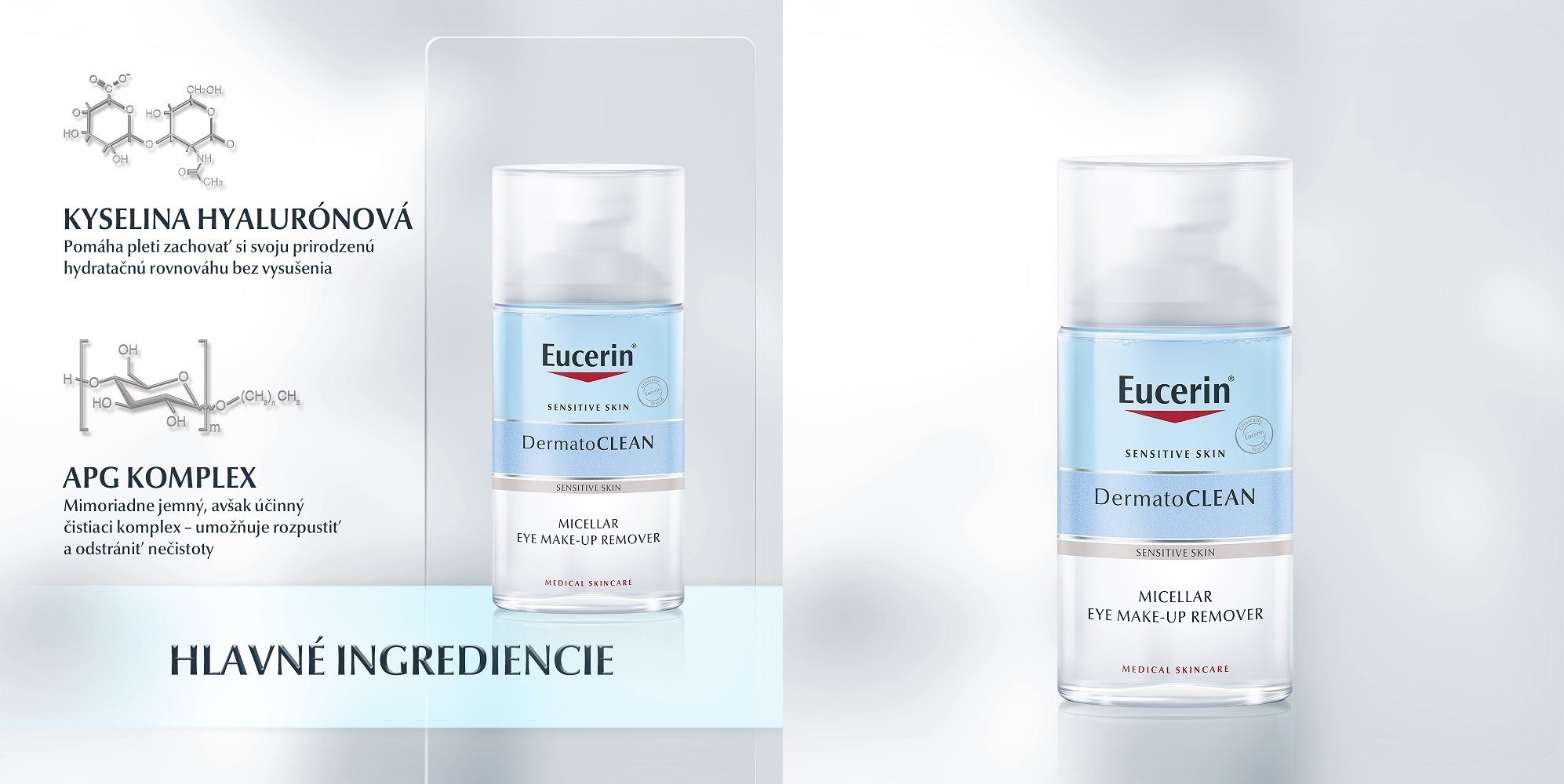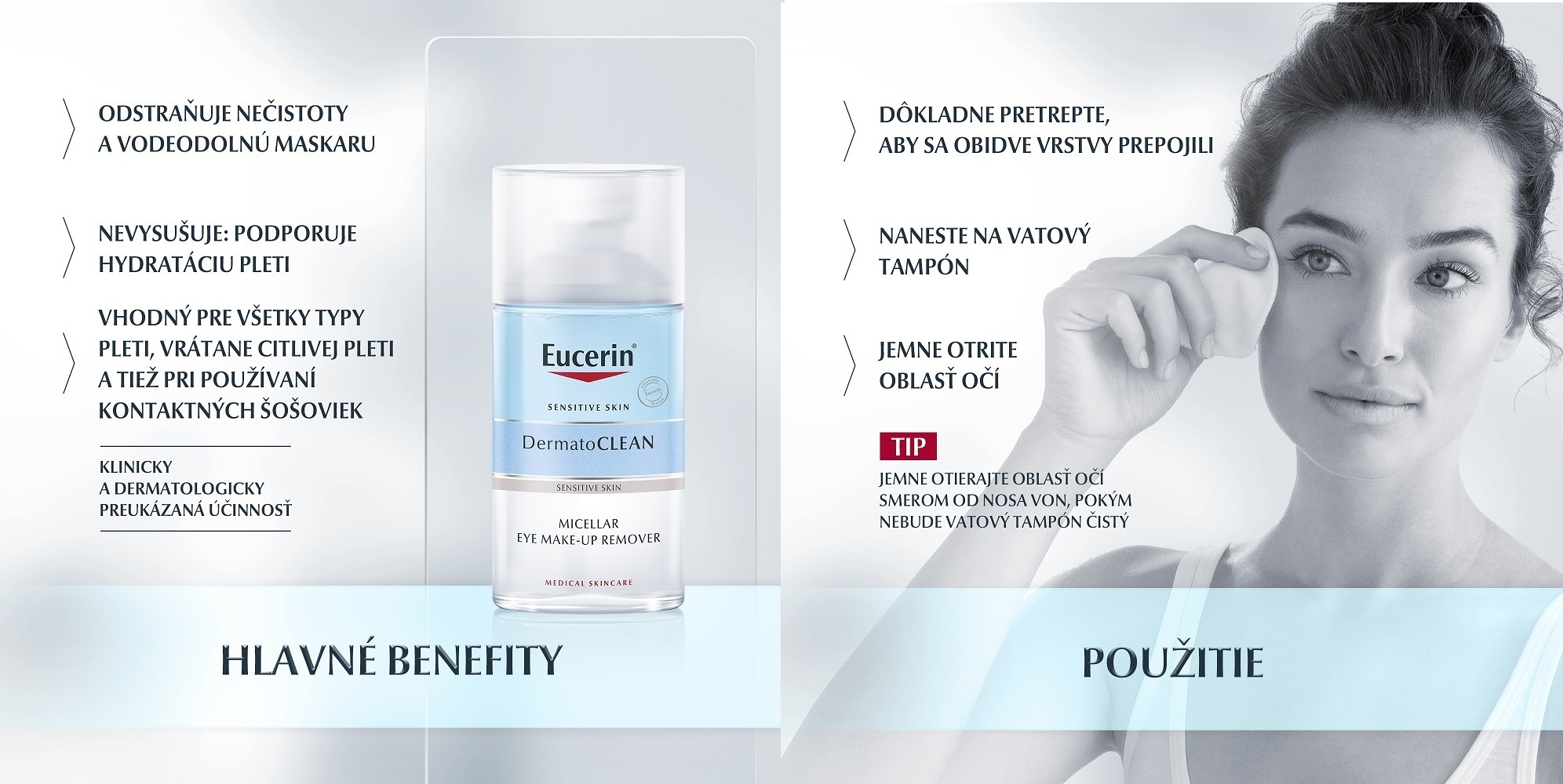 Eucerin DermatoCLEAN Hyaluron je jemný, ale účinný micelárny odličovač očného make-upu, ktorý odstraňuje aj tú najodolnejšiu vodoodolnú špirálu, ale je zároveň šetrný k citlivej pleti očného okolia. Je vhodný aj pre tých, ktorí používajú kontaktné šošovky.