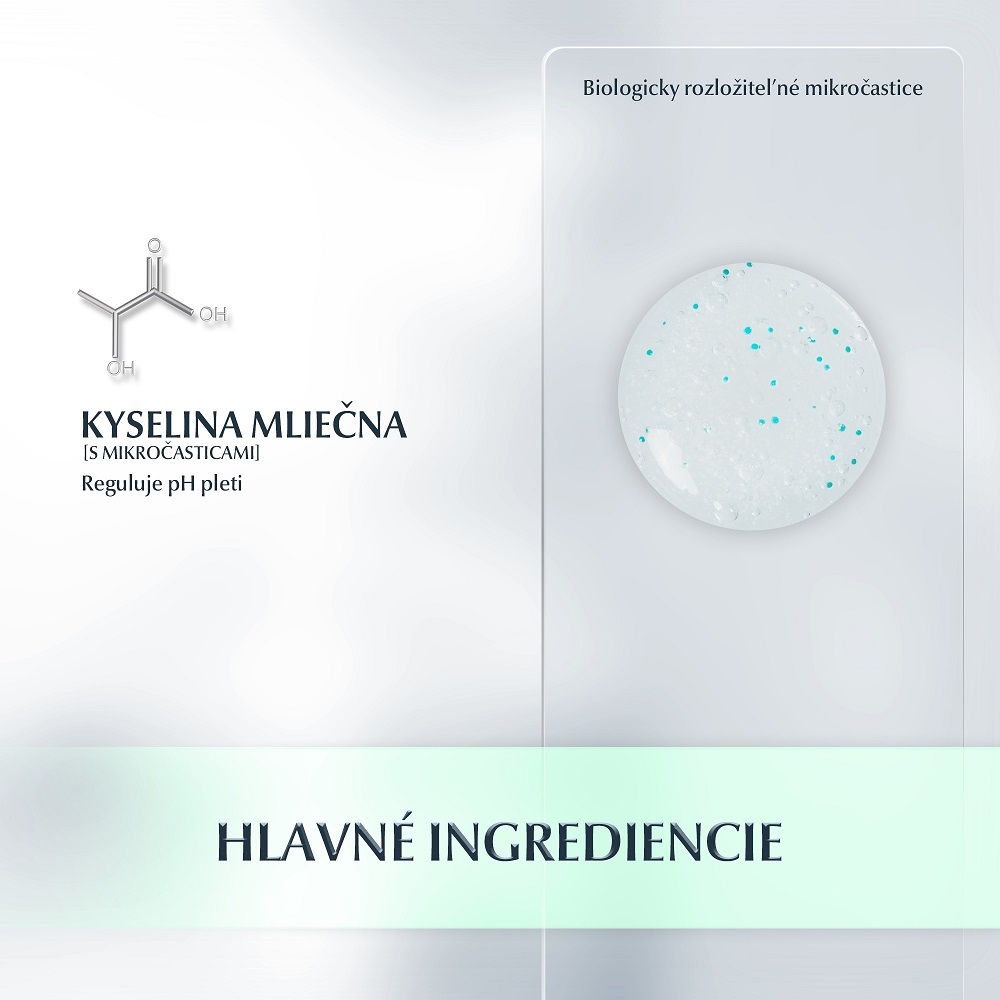 - Kyselina mliečna - s biologicky rozložiteľnými mikročasticami, reguluje pH pleti