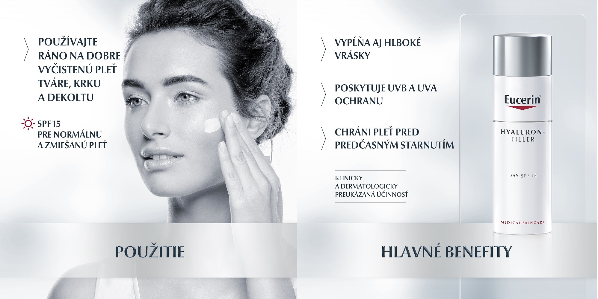 Eucerin Hyaluron-Filler denný krém s SPF 15 pôsobí proti procesu starnutia pleti. Pre viditeľne mladší vzhľad a pre hladšiu a žiarivejšiu pleť. Denný krém proti starnutiu pleti s 3 účinkami: