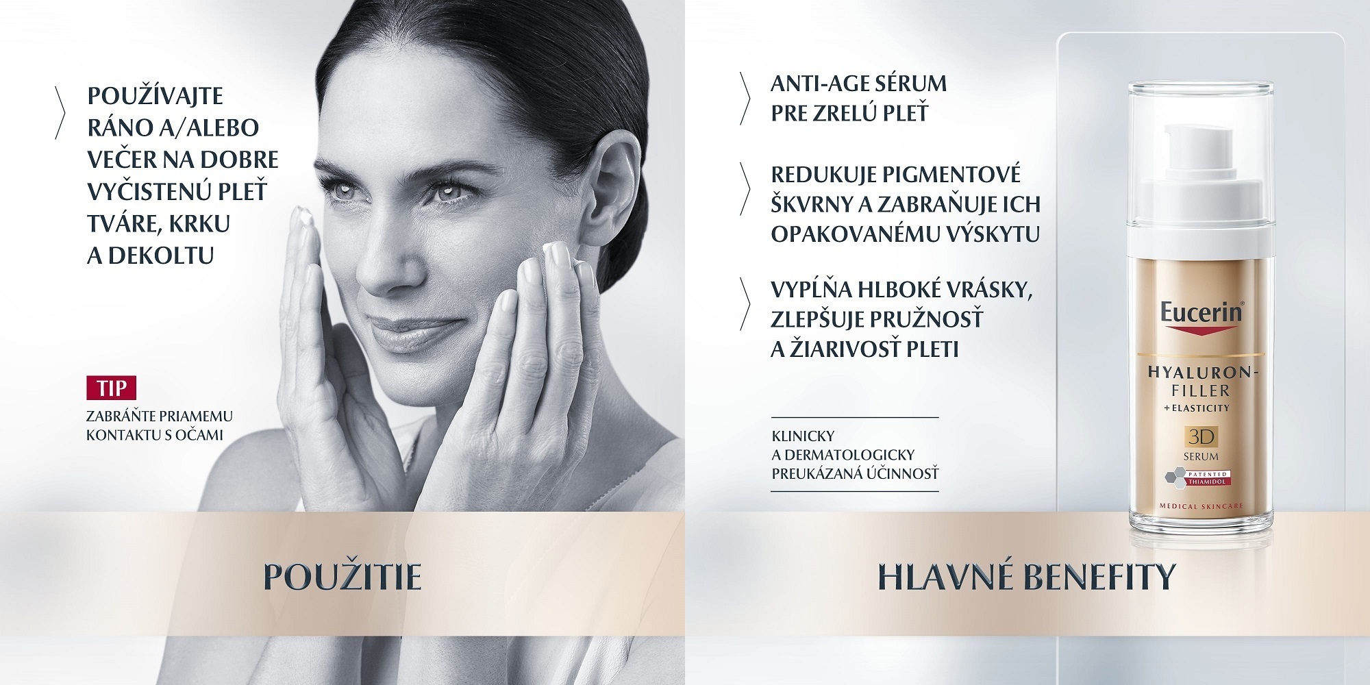 Eucerin Hyaluron-Filler Elasticity 3D Sérum s trojitým anti-age účinkom pre zrelú pleť redukuje pigmentové škvrny a bráni ich opakovanému výskytu, vypĺňa hlboké vrásky a zlepšuje pružnosť pleti.