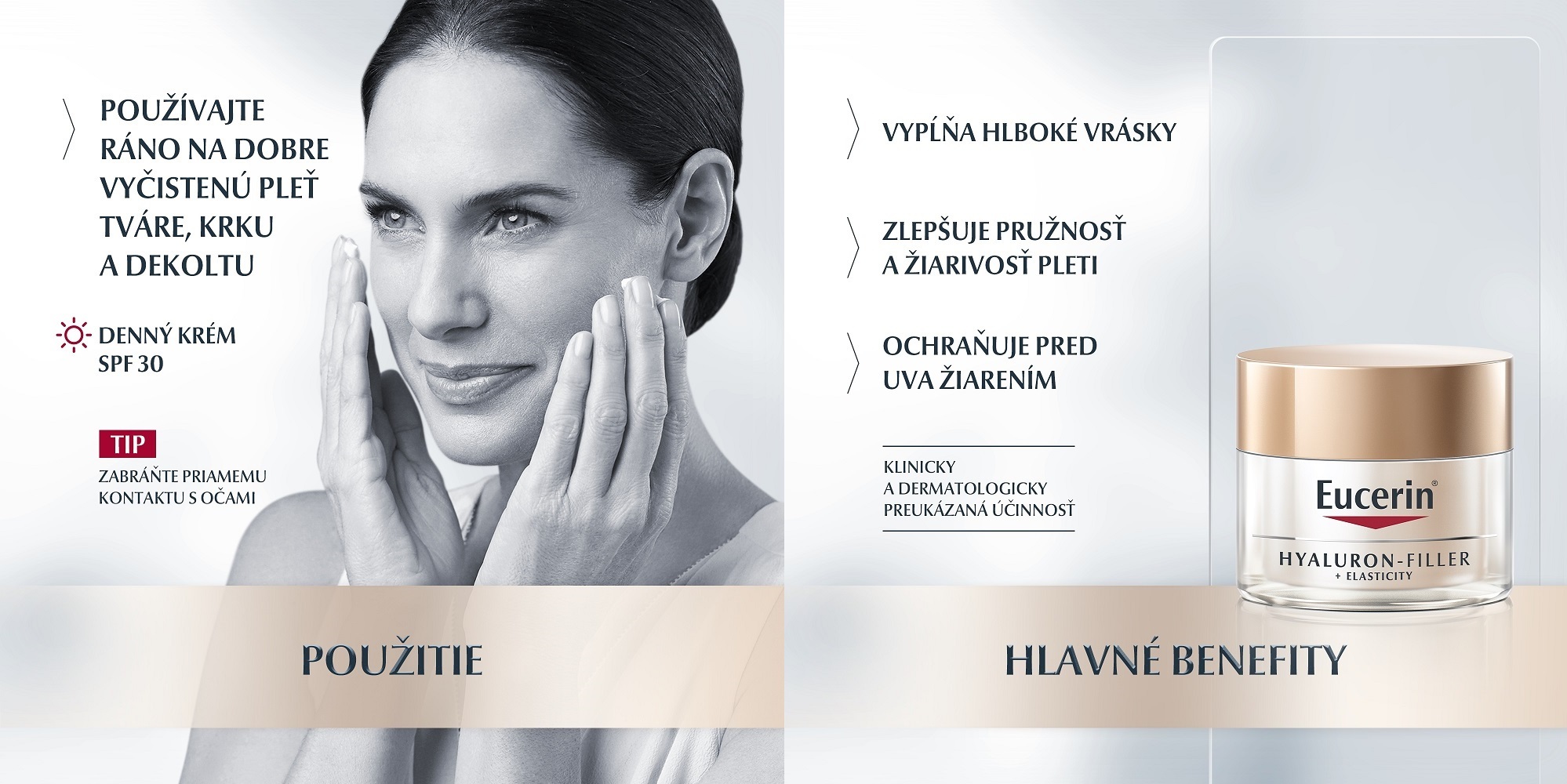 Anti-age denný krém pre zrelú pleť s SPF 30 a UVA ochranou Eucerin Hyaluron-Filler Elasticity vypĺňa hlboké vrásky a zlepšuje pružnosť pleti. Pleť je na dotyk pevná a na pohľad svieža a žiarivá.