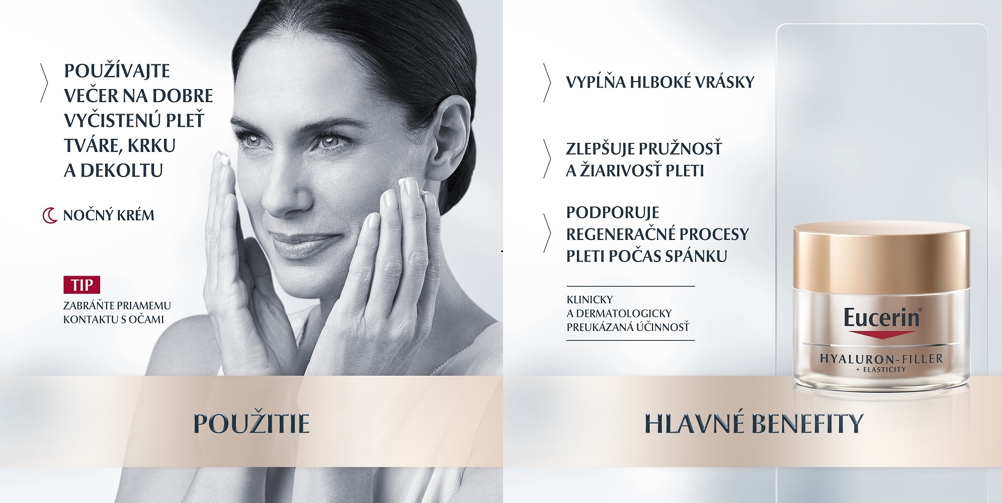Nočný krém proti starnutiu na zrelú pleť Eucerin Hyaluron-Filler Elasticity Nočný krém vypĺňa hlboké vrásky a zlepšuje pružnosť pleti. Pleť je na dotyk pevná a na pohľad svieža a žiarivá.