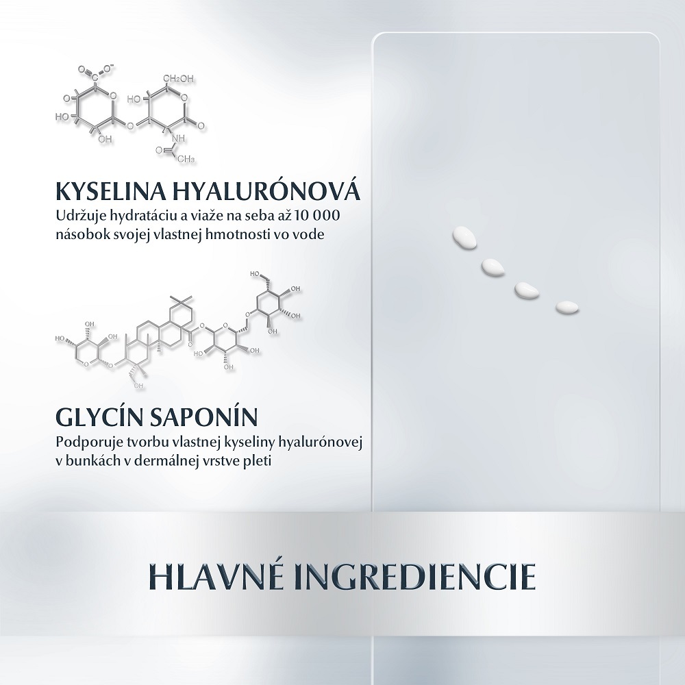 - Kyselina hyalurónová - udržuje hydratáciu a viaže na seba až 10 000 násobok svojej vlastnej hmotnosti vo vode