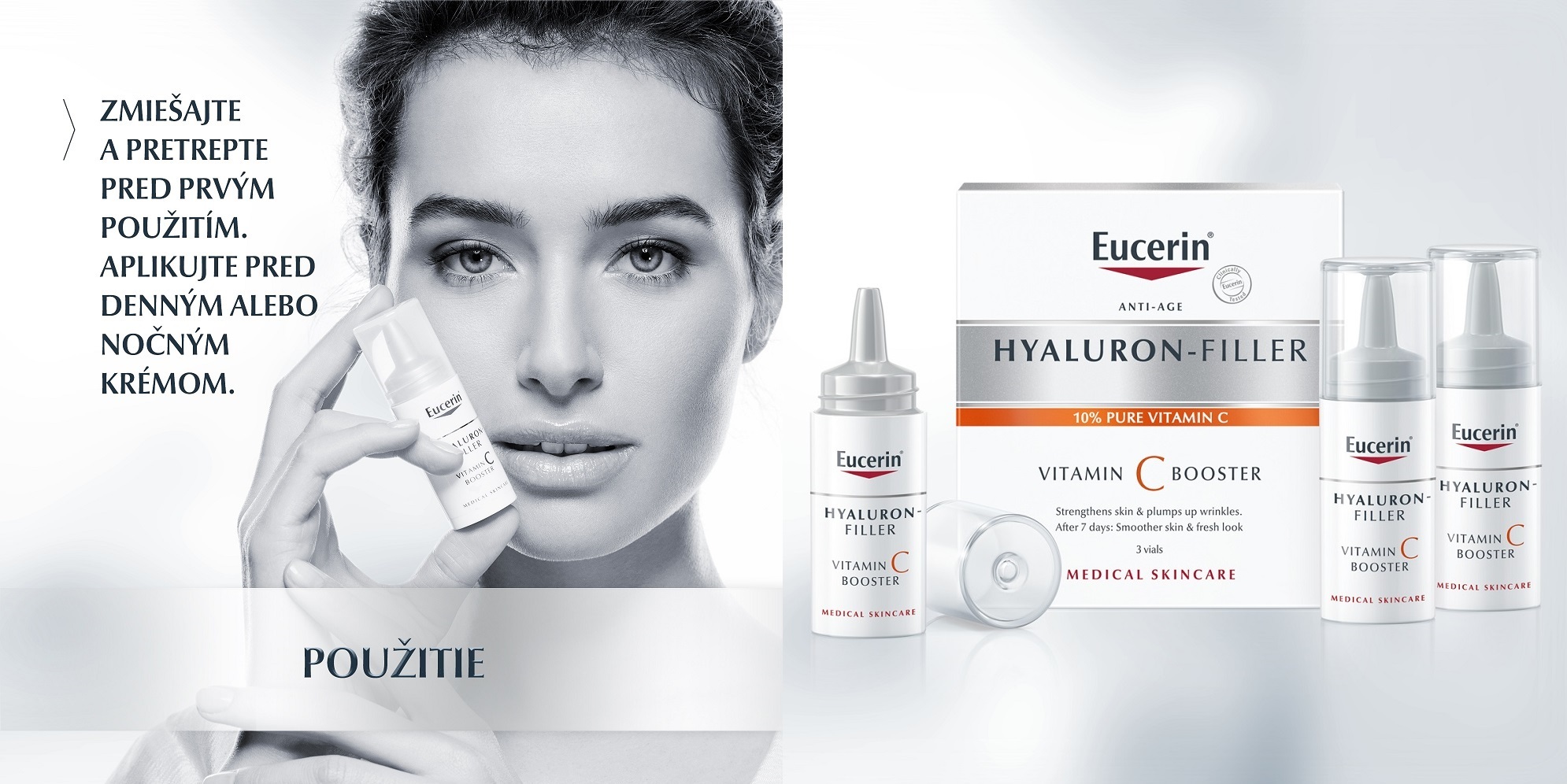 Eucerin Hyaluron-Filler Vitamin C booste je rýchlo sa vstrebávajúce sérum, ktoré pleť posilňuje a vyhladzuje, a zároveň vypĺňa vrásky. Pleť získa sviežejší a žiarivejší vzhľad iba za sedem dní. Anti-age sérum s 10 % čistým a čerstvo aktivovaným vitamínom C pre všetky typy pleti s 3x EFFECT – s 3 účinkami:
