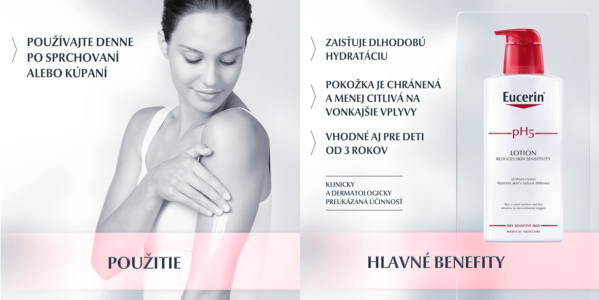 Suchú, citlivú pokožku ľahko podráždia nepriaznivé faktory vonkajšieho prostredia, ktoré jej citlivosť ešte viac zvyšujú. Na zníženie citlivosti potrebuje viac ako len jemný hydratačný prípravok. Eucerin pH5 Telové mlieko je jemný, ale účinný prípravok na hydratáciu pokožky tela, ktorý bol špeciálne vyvinutý na zvýšenie odolnosti a zníženie citlivosti suchej, citlivej pokožky. Unikátny Eucerin pH Balance System obsahuje pH5 citrátový pufor na obnovu a podporu optimálneho pH pokožky.