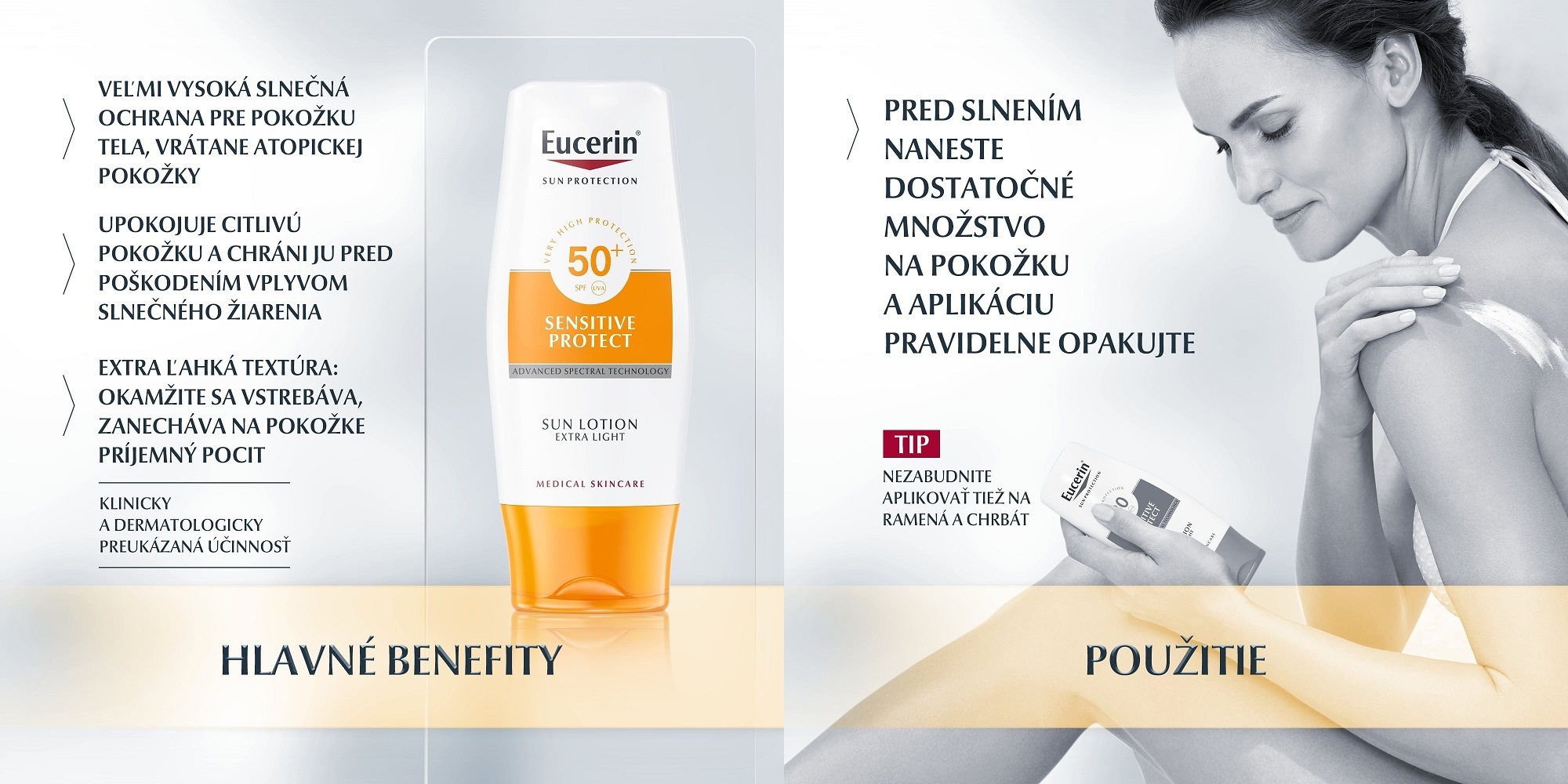 Vysoko kvalitné telové mlieko na opaľovanie s technológiou "Proti škvrnám po vypraní"*. Upokojuje a chráni citlivú pokožku vrátane atopickej pokožky. Technológia Advanced Spectral Technology značky Eucerin poskytuje vysoký ochranný faktor proti UVA/UVB žiareniu a obranu pred vysokoenergetickým viditeľným svetlom.