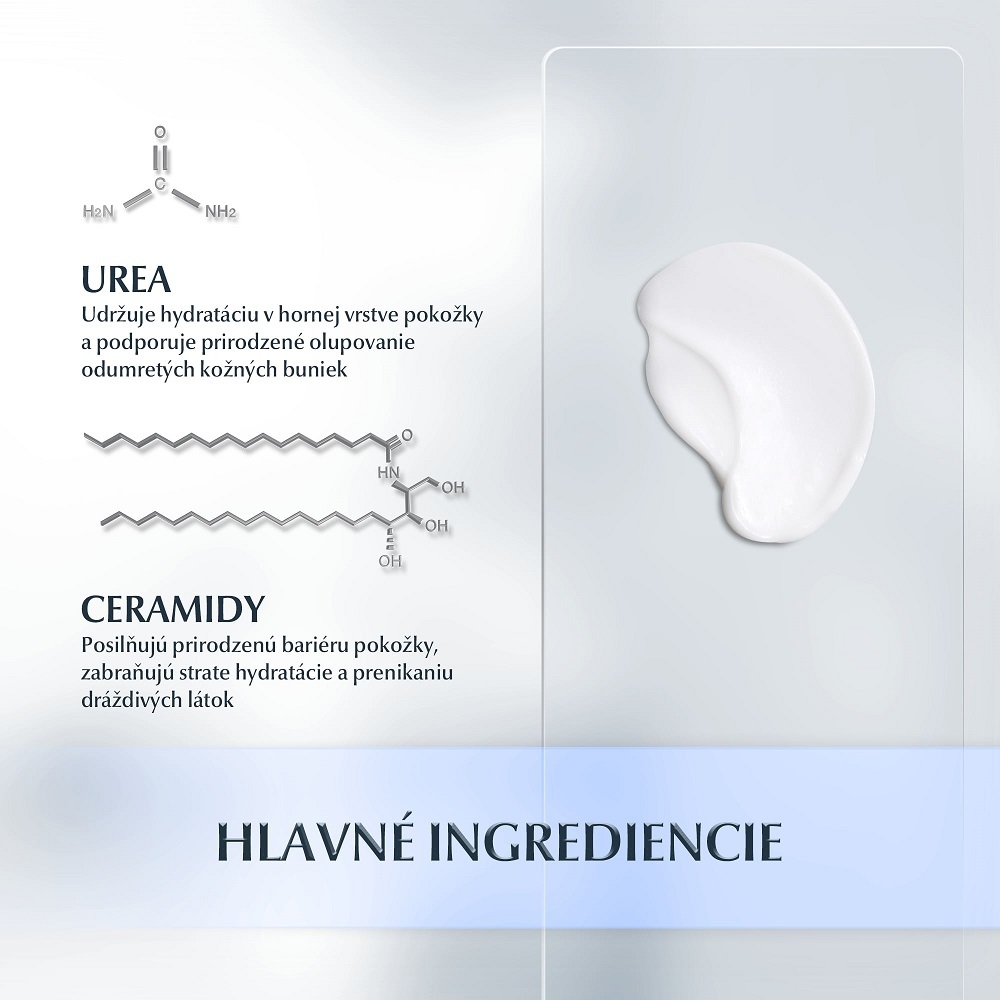 - Urea - Udržuje hydratáciu v hornej vrstve pokožky a podporuje prirodzené olupovanie odumretých kožných buniek