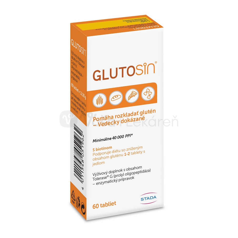 GLUTOSiN® je výživový doplnok s obsahom Tolerase® G (prolyl oligopeptidáza), ktorá pomáha rozkladať glutén získaný zo stravy - enzymatický prípravok. Minimálne 40 000 PPI* (571 000 PPI/gram) (PPI - Protease Picomole International označuje aktivitu enzýmu).