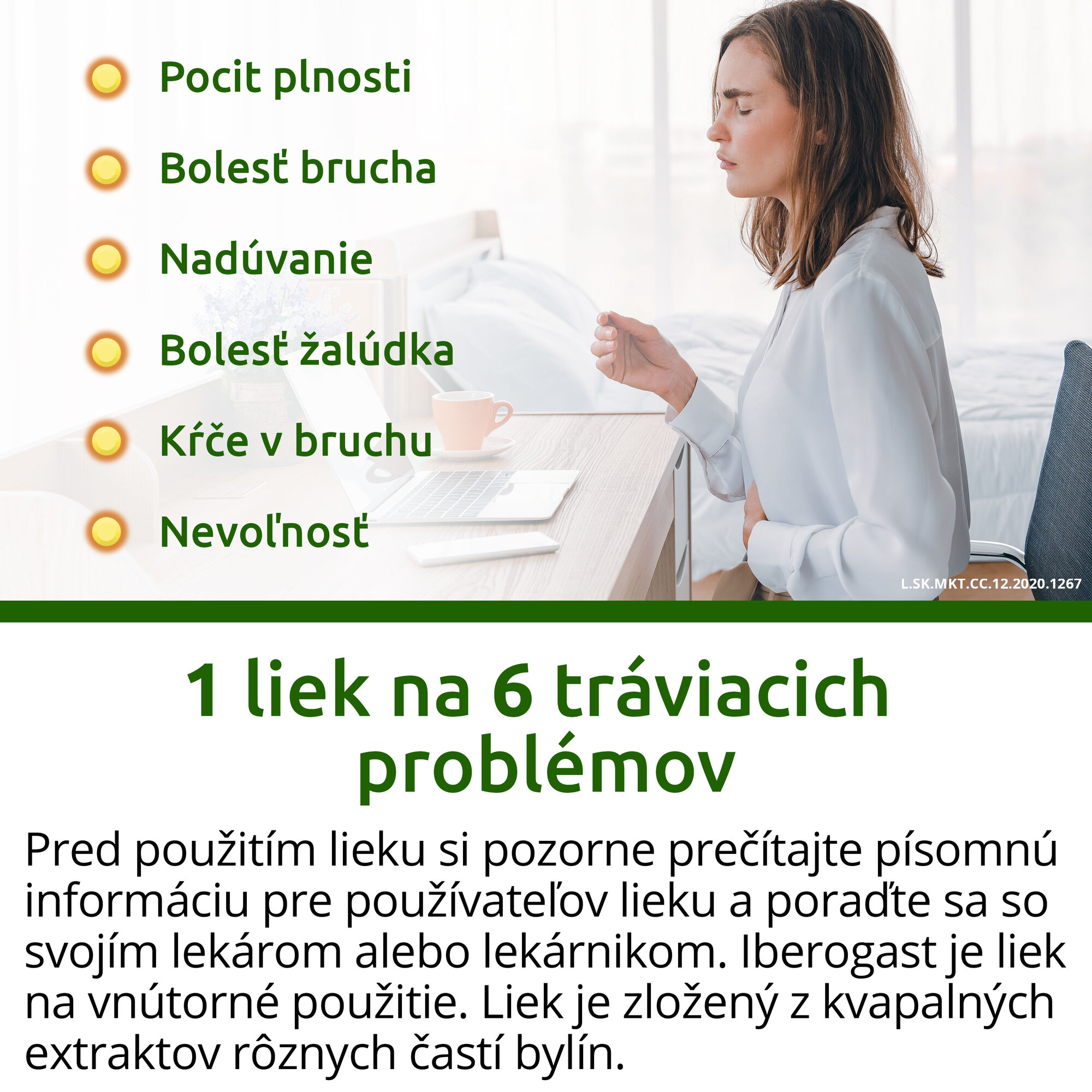 Pocit plnosti? Nadúvanie? Bolesť brucha? Kŕče? Bolesť žalúdka? Nevoľnosť? 6 problémov -1 liek.