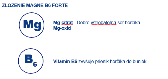 ÚČINNÉ ZLOŽKY VÝŽIVOVÉHO DOPLNKU MAGNE B6 FORTE: 2 tablety MAGNE B6 Forte obsahujú 200 mg horčíka a 3,2 mg vitamínu B6