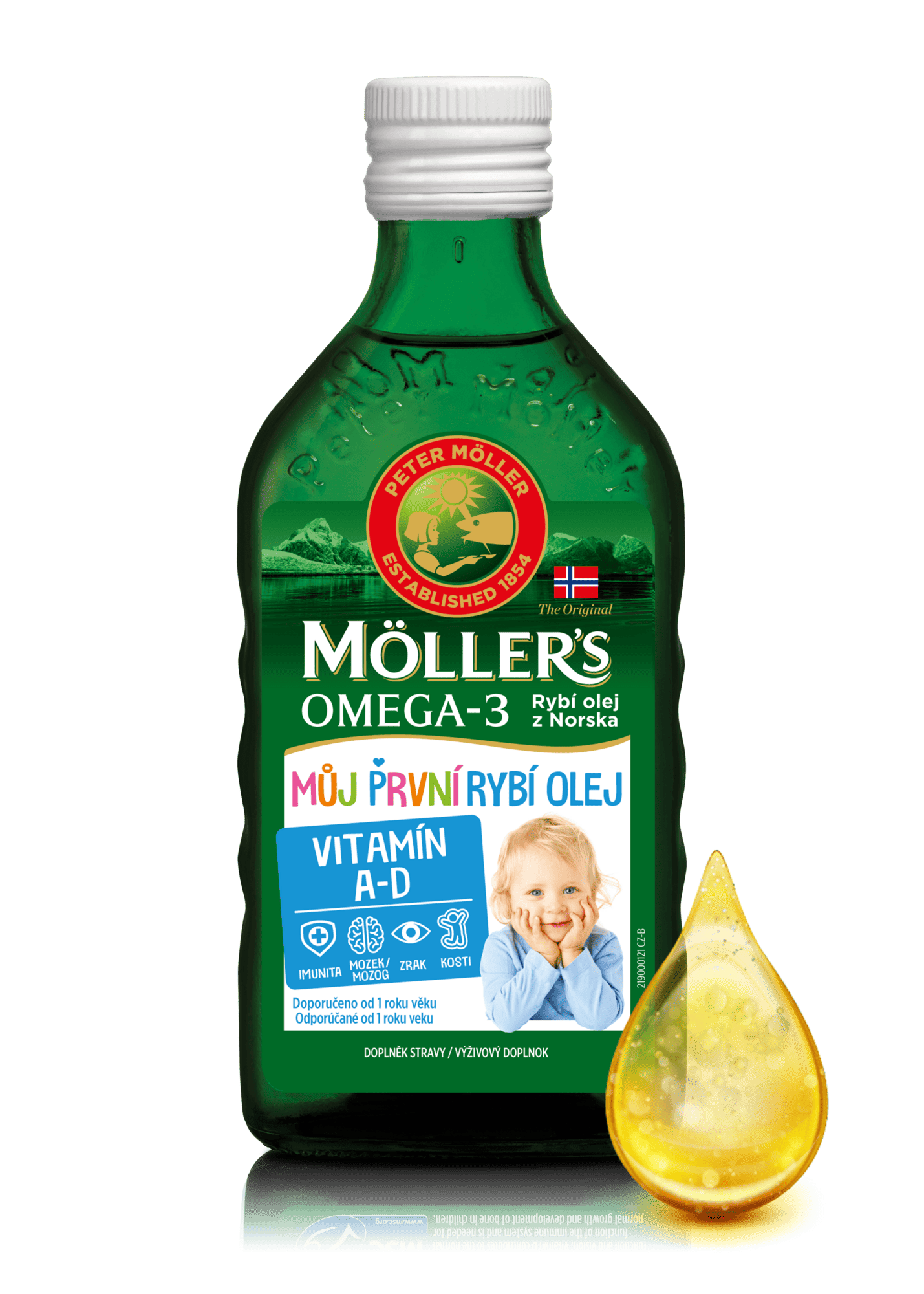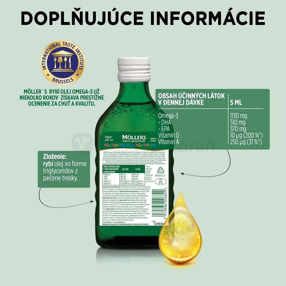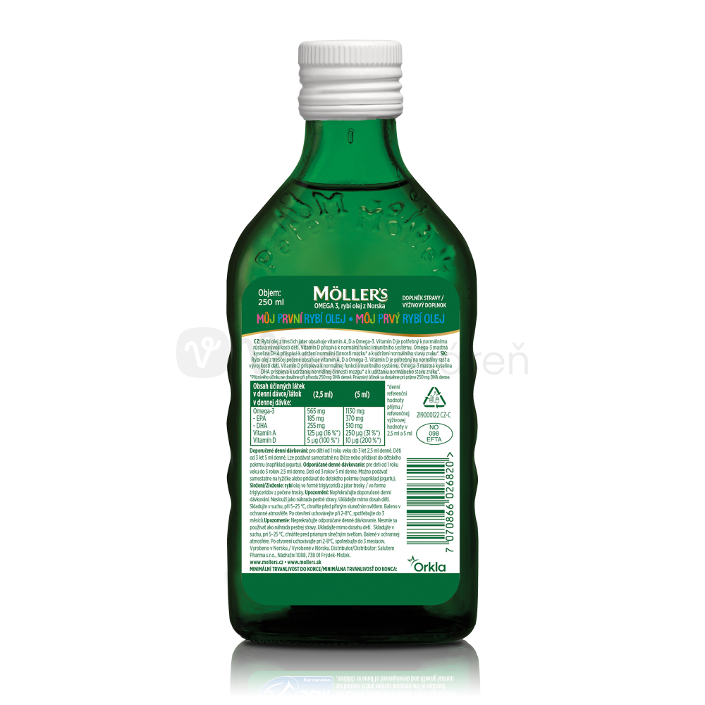 Zabezpečenie dostatočného príjmu všetkých potrebných živín je mimoriadne dôležité predovšetkým v prvých rokoch života. Olej z treščích pečení je vynikajúcim prírodným zdrojom omega-3 mastných kyselín (DHA, EPA). Je tiež bohatý na vitamíny A a D, ktoré sú dôležité pre zdravý rast detí a normálny vývoj zubov a kostí. Môj prvý rybí olej od Möller´s, na rozdiel od ostatných olejov, neobsahuje vitamín E (funkcia antioxidantu a konzervačnej látky), čím spĺňa tie najprísnejšie kritériá pre najmenšie deti.