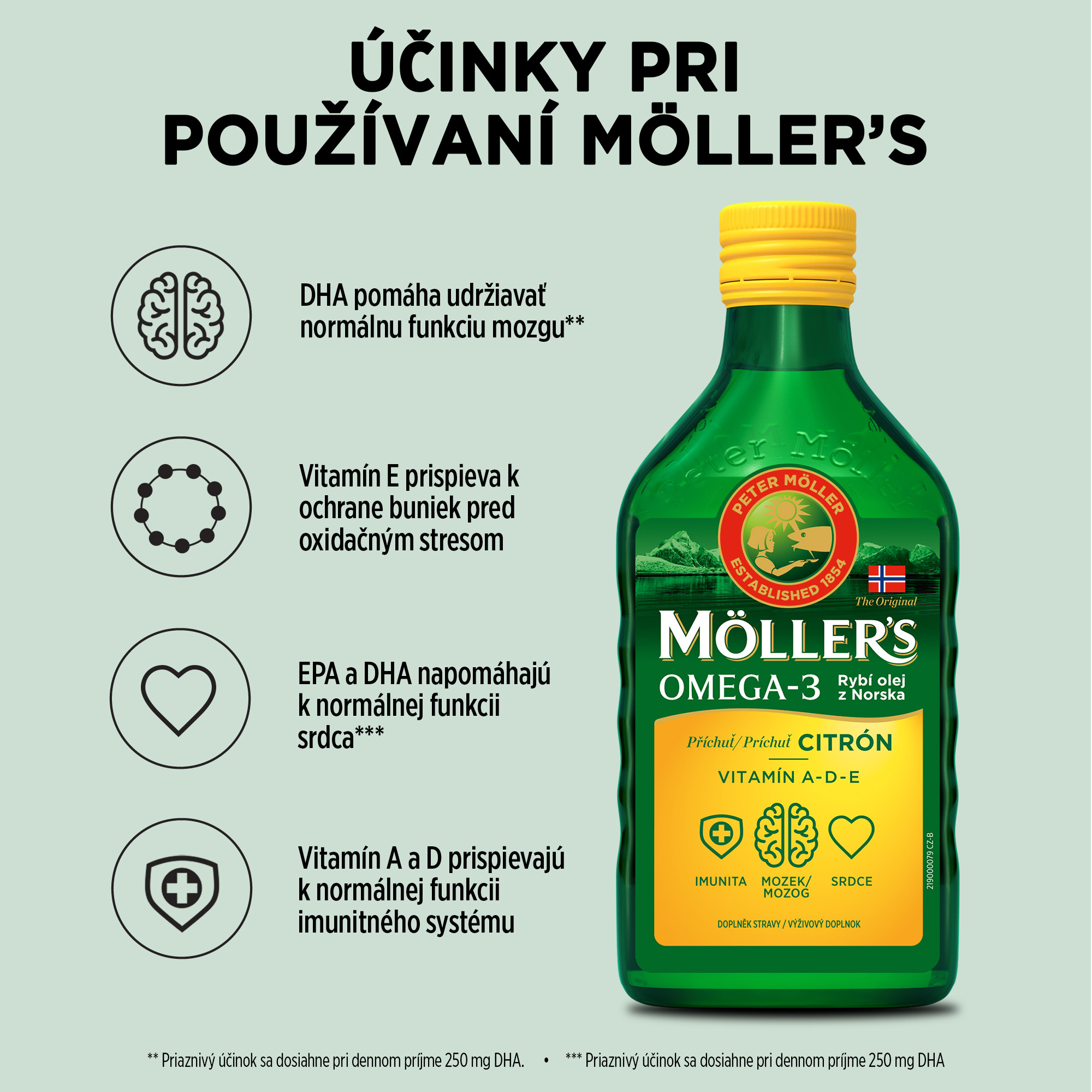*/** Priaznivý účinok sa dosiahne pri dennom príjme 250 mg *DHA/ **EPA a DHA. Möller´s Omega-3 Rybí olej s citrónovou príchuťou obsahuje už v jednej lyžičke (dávke) 860 mg DHA a EPA.