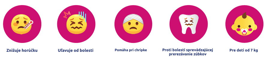 - pri bolesti rôzneho pôvodu (napr. bolesti hlavy, zubov vrátane bolesti sprevádzajúcej prerezávanie zúbkov a pri bolesti kĺbov a svalov sprevádzajúcej chrípkové ochorenia).
