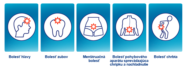 - pri bolestiach rôzneho pôvodu, napr. pri bolestiach hlavy, zubov, pri bolestivej menštruácii, bolesti hrdla a bolesti pohybového ústrojenstva nezápalového pôvodu.