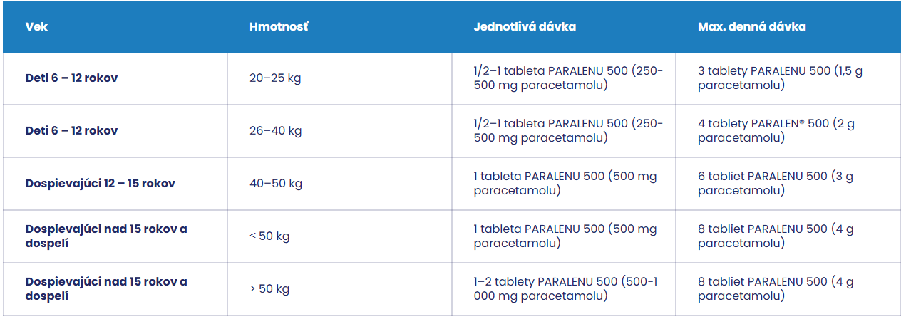 Liek PARALEN obsahuje v 1 tablete 500 mg Paracetamolu a môžu ho užívať dospelí a deti od 6 rokov (alebo s telesnou hmotnosťou vyššou ako 20 kg).