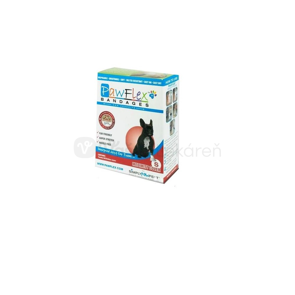 - PawFlex bandáže odpudzujú vodu. Obväz sa nepremáča olizovaním ani pôsobením vlhkosti či malého množstva vody.