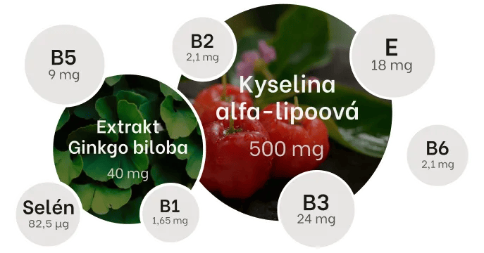 Kyselina alfa-lipoová - 500,00 mg; extrakt Ginkgo biloba (Ginko dvojlaločné štand. extrakt) - 40,00 mg, vitamín B3 (nikotínamid) - 24,00 mg (150 %), vitamín E (DL-α-tokoferylacetát) - 18,00 mg (150 %), vitamín B5 (D-pantotenát vápenatý) - 9,00 mg (150 %), vitamín B6 (pyridoxínhydrochlorid) - 2,10 mg (150 %), vitamín B2 (riboflavín) - 2,10 mg (150 %), vitamín B1 (tiamín mononitrát) - 1,65 mg (150 %), selén (seleničitan sodný) - 82,5 µg (150 %).