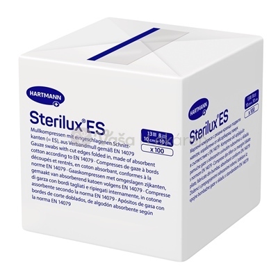 Kompresy Sterilux ES sú krytie z obväzovej gázy s 13 vláknami, 8 vrstvami a so založenými zahstrihnutými okrajmi.