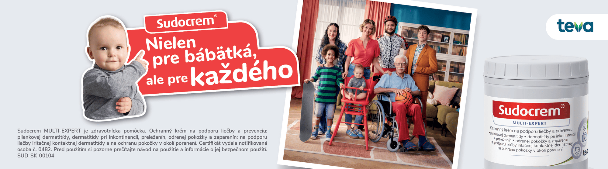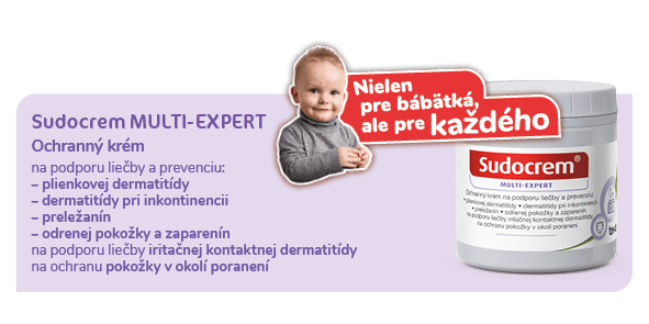 Upozornenie: Sudocrem MULTI-EXPERT je zdravotnícka pomôcka. Ochranný krém na podporu liečby a prevenciu plienkovej dermatitídy, dermatitídy pri inkontinencii, preležanín, odrenej pokožky a zaparenín, na podporu liečby iritačnej kontaktnej dermatitídy a na ochranu pokožky v okolí poranení. Certifikát vydala notifikovaná osoba č. 0482. Pred použitím si pozorne prečítajte návod na použitie a informácie o jej bezpečnom použití.