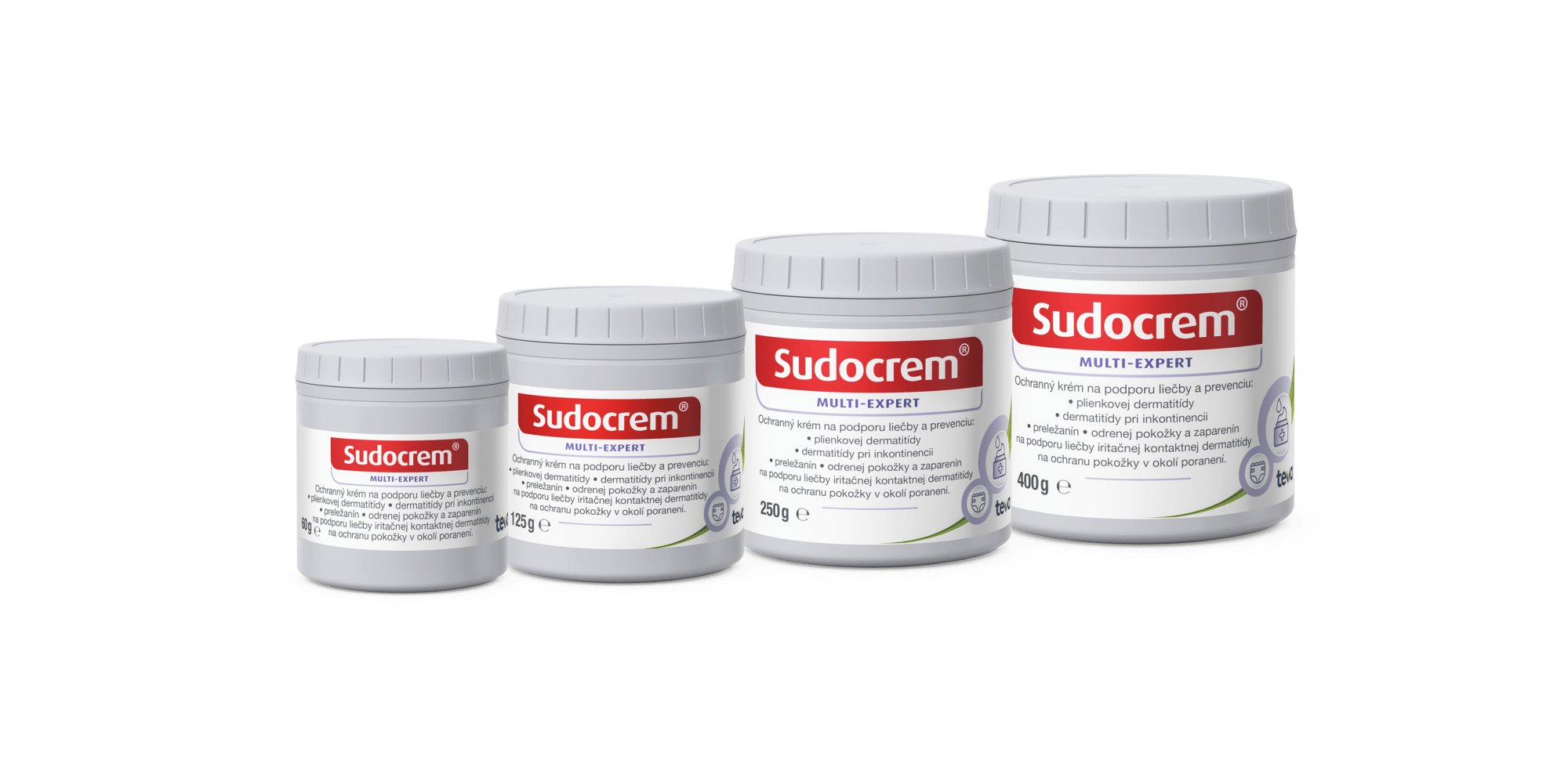 Sudocrem MULTI-EXPERT je dostupný vo viacerých veľkostiach balenia: 60 g, 125 g, 250 g a 400 g. Novinkou je cestovné balenie My little Sudocrem, ktoré môžete mať vďaka jeho kompaktnej veľkosti stále poruke.