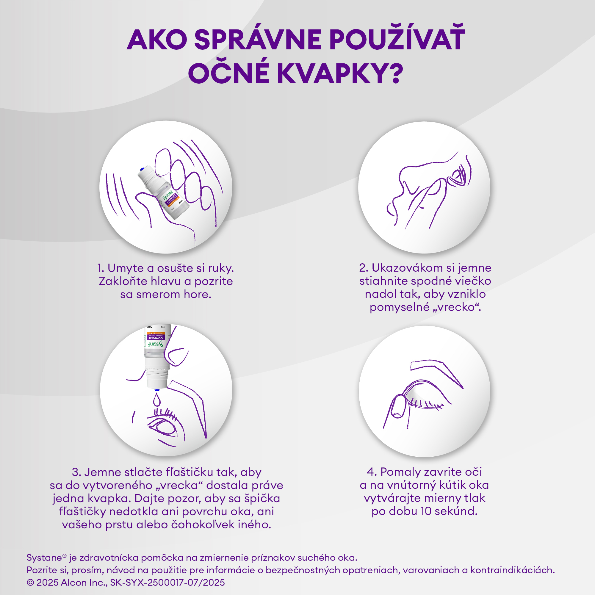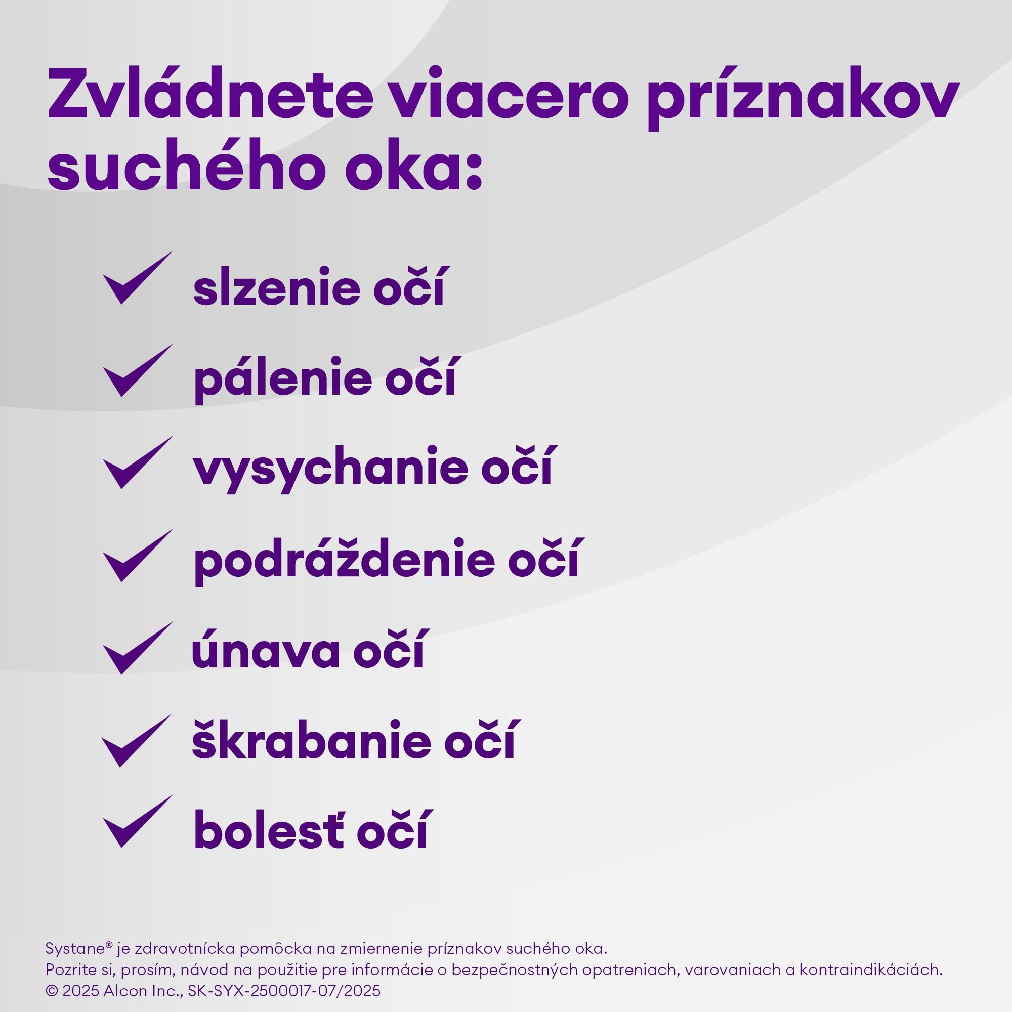- Systane® je zdravotnícka pomôcka na zmiernenie príznakov suchého oka. Pozorne si prečítajte návod na použitie pre informácie o bezpečnostných opatreniach, varovaniach a kontraindikáciách. Len na očné použitie.