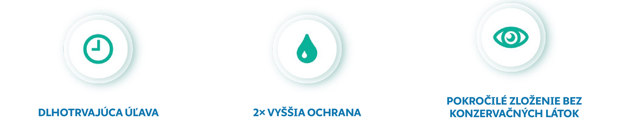 Dvojzložková receptúra s kyselinou hyalurónovou a HP-Guar zlepšuje udržiavanie zvlhčenia, zvyšuje ochranu pred vysychaním a tiež podporuje regeneráciu povrchu oka.