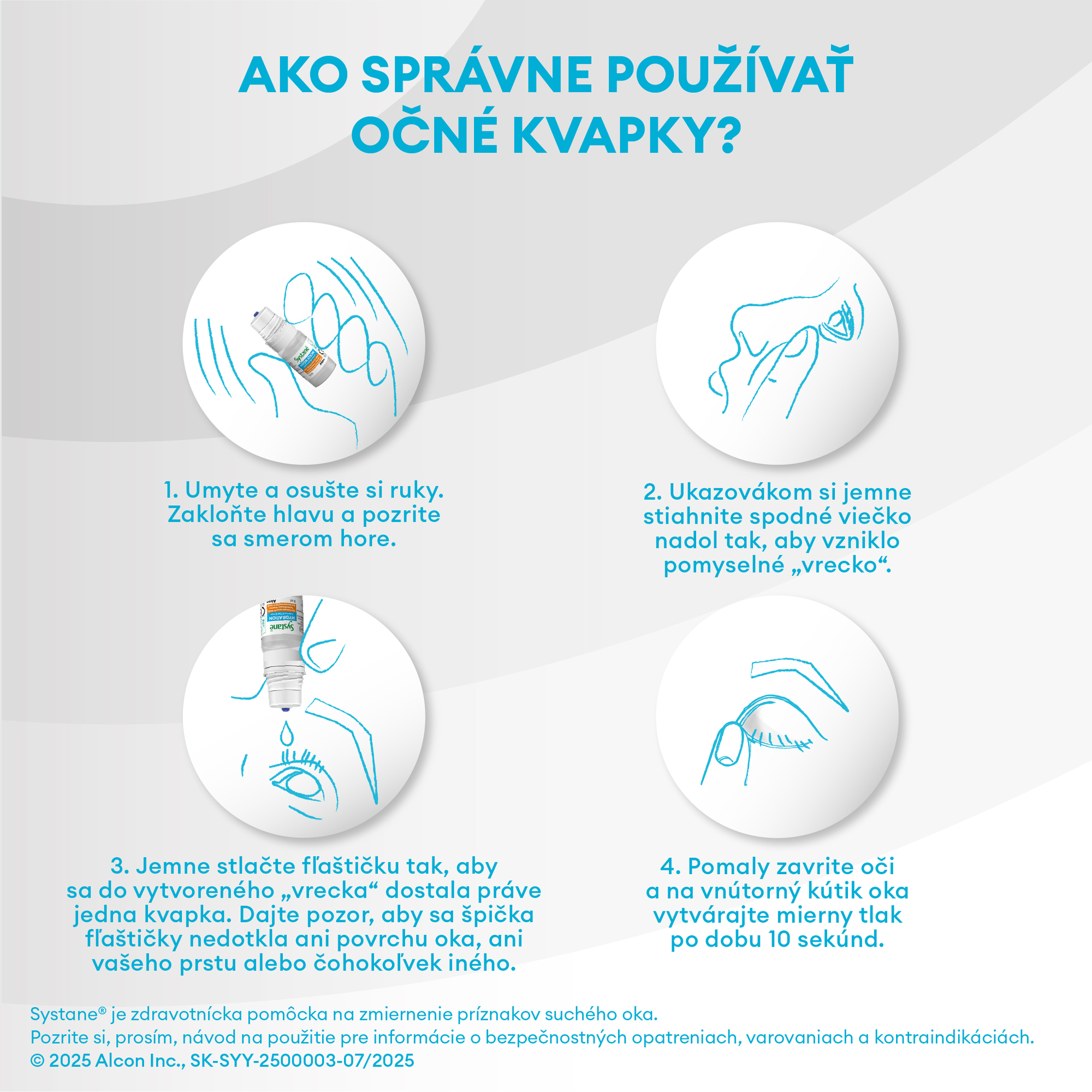 - Systane® je zdravotnícka pomôcka na zmiernenie príznakov suchého oka. Pozorne si prečítajte návod na použitie pre informácie o bezpečnostných opatreniach, varovaniach a kontraindikáciách. Len na očné použitie.