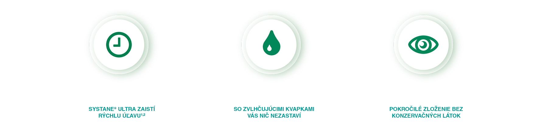 Zvlhčujúce očné kvapky Systane® ULTRA bez konzervačných látok s patentovanou zložkou HP-Guar okamžite hydratujú očný povrch, prinášajú suchým, unaveným a podráždeným očiam upokojenie a poskytnú vám rýchlu úľavu od príznakov suchého oka 1,2 vždy, keď to potrebujete. Sú vhodné: