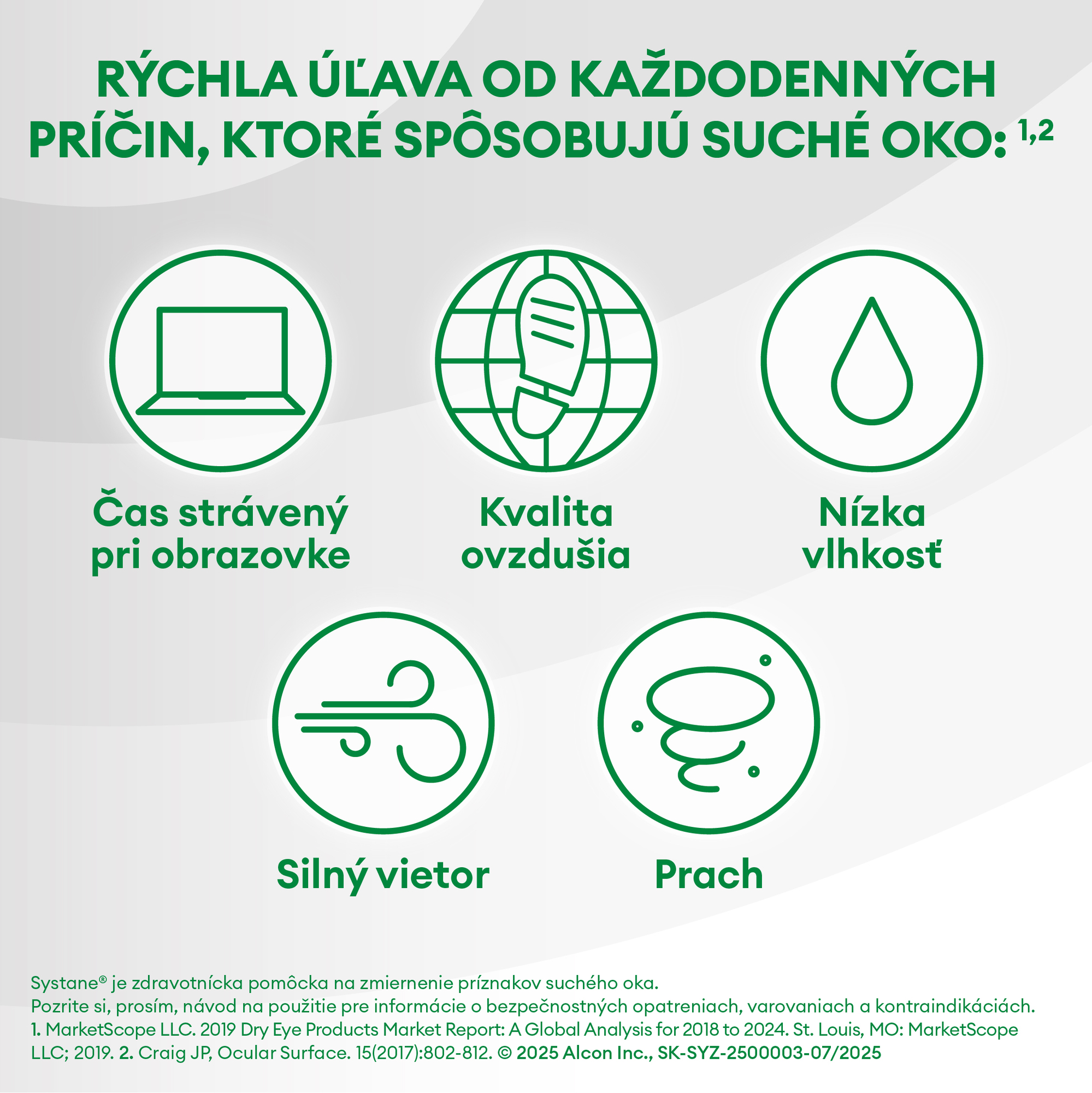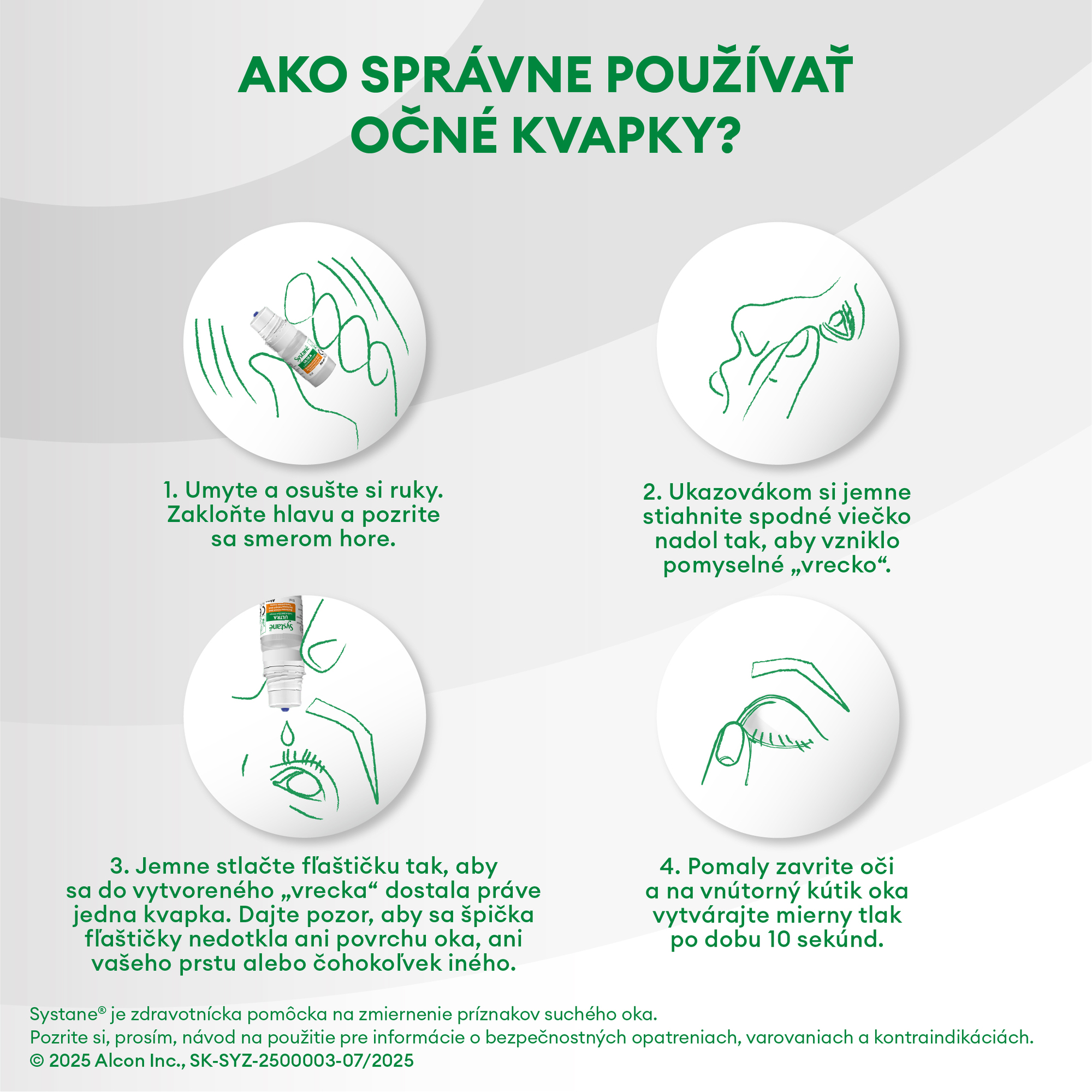 - Systane® je zdravotnícka pomôcka na zmiernenie príznakov suchého oka. Pozorne si prečítajte návod na použitie pre informácie o bezpečnostných opatreniach, varovaniach a kontraindikáciách. Len na očné použitie.