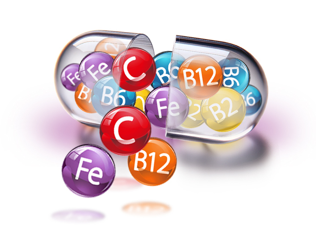 - Vitamín B12 (kyanokobalamín) – má priaznivý vplyv na tvorbu červených krviniek. Prispieva k normálnej činnosti nervovej sústavy, k správnej funkcii psychiky, k zníženiu vyčerpania a únavy a k normálnej funkcii imunitného systému