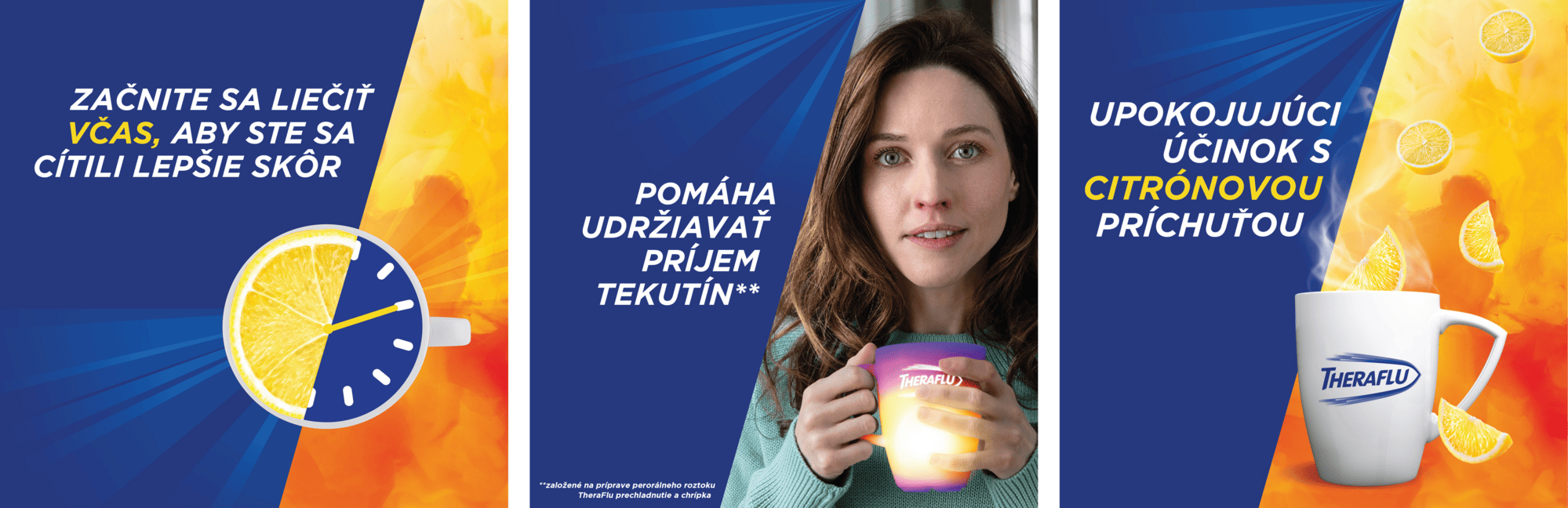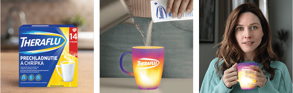 Horúci nápoj. Komfortné užívanie lieku, výhodné pre ľudí, ktorí majú problém s prehĺtaním tabliet či kapsúl. Theraflu vás navyše zahreje a pomôže vám udržiavať príjem tekutín.2