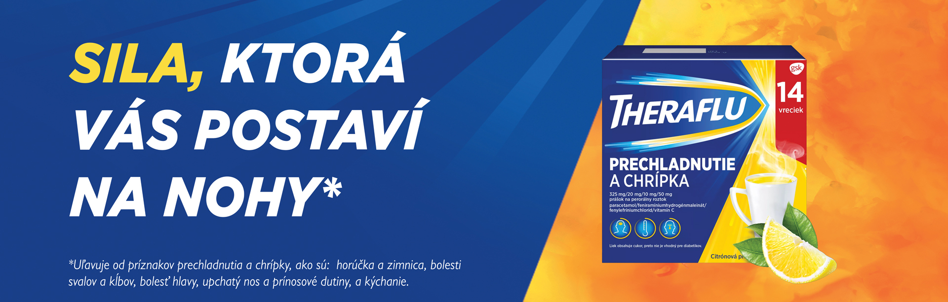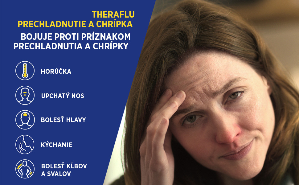 Theraflu Prechladnutie a chrípka, liek na prípravu horúceho nápoja s citrónovou príchuťou, obsahuje kombináciu 4 účinných látok. To z neho robí všestranný liek, ktorý tlmí väčšinu príznakov chrípky a prechladnutia. Theraflu vás zbaví nepríjemných pocitov a postaví vás na nohy pri prvých príznakoch prechladnutia a chrípky a vy sa tak budete môcť venovať činnostiam, na ktorých vám záleží.