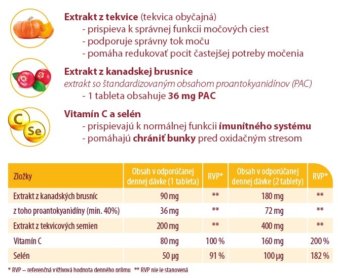 - Extrakt z tekvice prispieva k správnej funkcii močových ciest, podporuje správny tok moču, pomáha redukovať pocit častejšej potreby na močenie