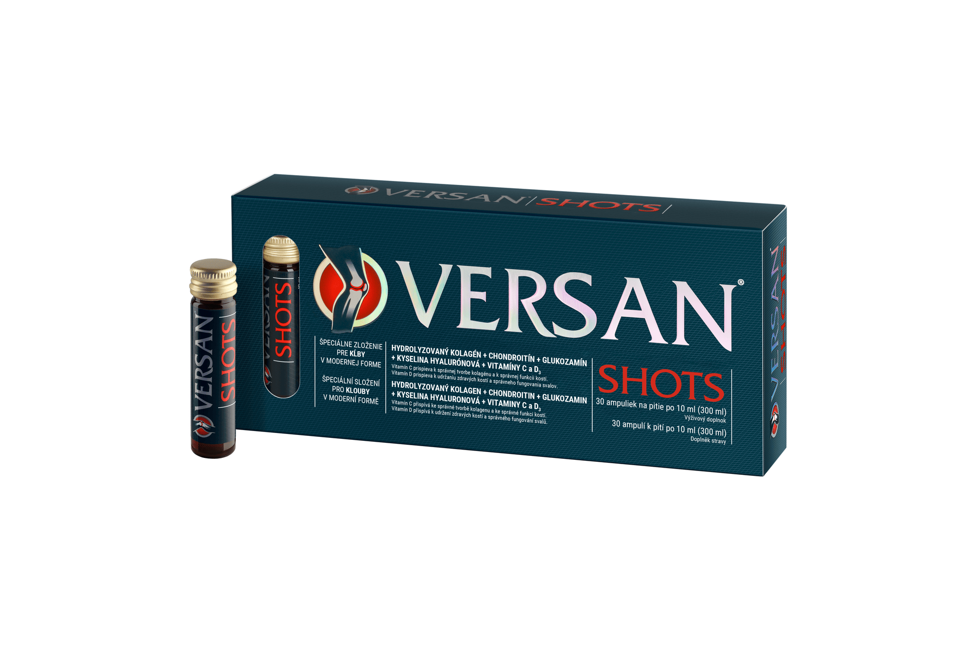 Výživový doplnok na kĺby s komplexným zložením v jednorazových ampuliach – shotoch. Kĺbová výživa Versan Shots prakticky a jednoducho dopĺňa telu potrebné účinné látky ako hydrolyzovaný kolagén, chondroitín a glukozamín sulfát, kyselinu hyalurónovú a vitamín C a D3.
