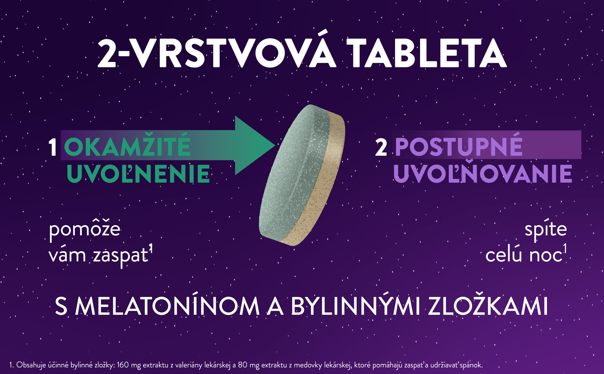 - Inovatívna dvojvrstvová tableta: Kombinuje rýchly nástup účinku (rýchle zaspatie) a dlhotrvajúce pôsobenie až na 8 hodín1,2 (postupné uvoľňovanie melatonínu a bylinných extraktov).